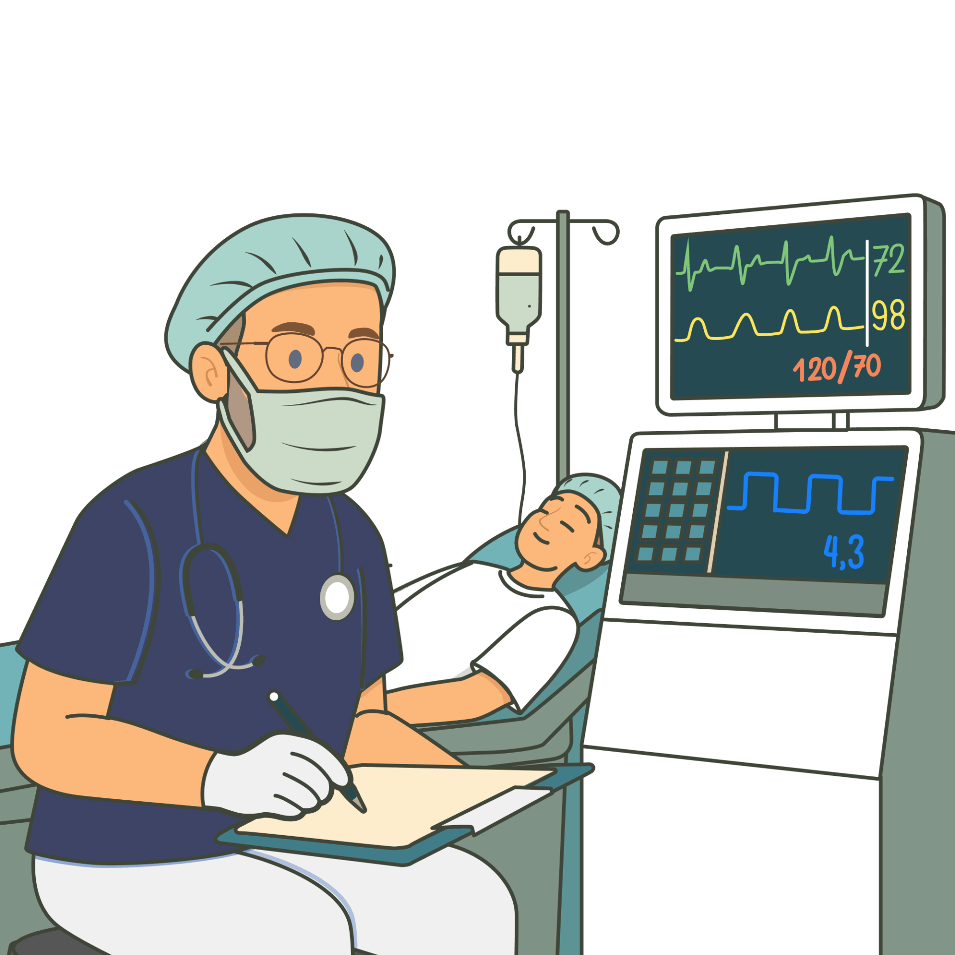 Am Operationstag werden Sie vom Anästhesie-Team in Empfang genommen. Nach einem Sicherheits-Check folgt das Anbringen des Überwachungsmonitors und es wird ein venöser Zugang gelegt. Darüber können alle notwendigen Medikamente für eine Vollnarkose oder einen Dämmerschlaf gegeben werden; ausserdem dient er als Sicherheit bei einer Teilnarkose. Ist die Narkose eingeleitet, kann die Operation starten. Sie werden dabei die ganze Zeit vom Narkoseteam überwacht. Sollten Sie eine Teilnarkose gewählt haben, können Sie dabei auch etwas Musik hören. Am Ende der Operation werden die Narkosemittel gestoppt und Sie wachen wieder auf. Da Sie in der Regel noch etwas müde sind, begleiten wir Sie in einen ruhigen Raum, wo Sie noch vollständig aufwachen können. Dabei werden Ihre Vitalwerte kontinuierlich weiter überwacht. Sobald Sie sich gut und sicher auf den Beinen fühlen und auch von Seite des Behandlungsteams alles in Ordnung ist, dürfen Sie die Praxis verlassen.